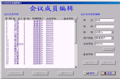 ·成員編輯:即設(shè)置會(huì)議成員數(shù)據(jù)。進(jìn)行會(huì)議操作之前必須先設(shè)置會(huì)議成員數(shù)據(jù)。會(huì)議成員數(shù)據(jù)包括:人員姓名、常用號碼、備用號碼、密碼、級別(會(huì)議主持人、發(fā)言人、聽眾)。會(huì)議主持人一個(gè),會(huì)議成員個(gè)數(shù)不限,但總數(shù)不超過180個(gè)。
