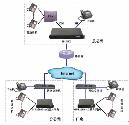 各分公司根據實際分機數配置相應的接入網關或IP話機。接入網關和IP話機通過Internet注冊到位于總公司的IP-PBX上,實現了總部電話和分公司、廠房電話之間的通信、號碼直撥、來電顯示等功能。