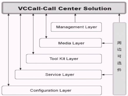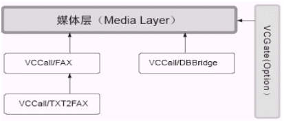 Media Layer由VCCall/DBBridge、VCGate(Option)、VCCall/FAX、VCCall/TXT2FAX、VCCall/FAX、VCCall/TXT2FAX組成VCCall媒體層提供了除電話(huà)之外進(jìn)行交互的其他媒體組件,包括:傳真VCCall/FAX、數(shù)據(jù)庫(kù)訪(fǎng)問(wèn)媒體VCCall/DBBridge。