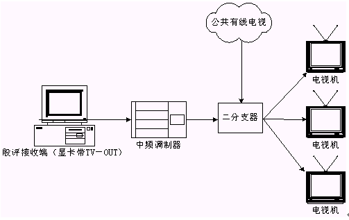 本系統(tǒng)接收端接收實(shí)時(shí)廣播時(shí),除了用普通PC機(jī)收看,或把PC機(jī)接收到的信號(hào)輸?shù)诫娨暎ù笃粒┥鲜湛,甚至還可以接入有線(xiàn)電視網(wǎng)進(jìn)行播放。具體方法是通過(guò)一個(gè)接收端接收股評(píng)節(jié)目,通過(guò)帶TV-OUT的顯卡把TV信號(hào)輸出到中頻調(diào)制設(shè)備,中頻調(diào)制設(shè)備可以把基帶模擬信號(hào)轉(zhuǎn)換成一個(gè)有線(xiàn)電視信號(hào),且傳輸距離遠(yuǎn),損失小,再把這個(gè)信號(hào)與有線(xiàn)電視信號(hào)一起接入一個(gè)二分支器(2進(jìn)1出),這就可以和公共有線(xiàn)電視共存,形成自己的頻道,供電視接收。