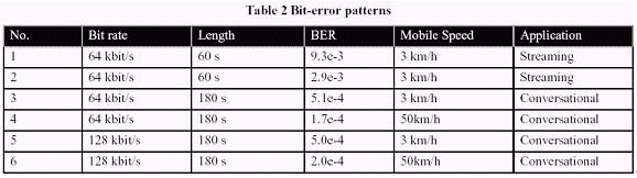 在H.264/AVC的標(biāo)準(zhǔn)化進(jìn)程中,移動(dòng)視頻傳輸?shù)闹匾砸呀?jīng)在3G移動(dòng)傳輸里面通過對(duì)基于H.324M的電路交換會(huì)話服務(wù)、包交換會(huì)話和流服務(wù)得到了證實(shí)。這些測(cè)試情況允許適當(dāng)?shù)木幋a特征、測(cè)試和容錯(cuò)仿真等特征的選擇,同時(shí)也可以得到有意義的測(cè)試結(jié)果。在本文,我們將會(huì)把重心集中在基于IP的測(cè)試情況。在正常的測(cè)試情況下,我們會(huì)定義6個(gè)測(cè)試情形組合,主要測(cè)試通過3G移動(dòng)網(wǎng)絡(luò)的包交換會(huì)話服務(wù)和包交換流媒體服務(wù)。另外,測(cè)試環(huán)境包括簡(jiǎn)單的脫機(jī)3GPP/3GPP2仿真軟件、程序接口和評(píng)估標(biāo)準(zhǔn)。無線信道使用專門生產(chǎn)用于移動(dòng)無線信道仿真的位率差錯(cuò)模板來進(jìn)行仿真。 位率差錯(cuò)模板在物理層上和RLC/RLP層下來捕獲,因此,它們?cè)趯?shí)驗(yàn)被用于物理層仿真。通過位率差錯(cuò)模板實(shí)驗(yàn)中得出的碼率、長(zhǎng)度、位錯(cuò)誤率和移動(dòng)速度數(shù)據(jù)詳見下表2。