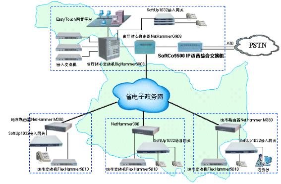 ×省×廳和與各地市局之間原來(lái)采用PSTN網(wǎng)絡(luò)實(shí)現(xiàn)語(yǔ)音通信,省局和市局,市局和市局之間每個(gè)月的通訊費(fèi)用高達(dá)數(shù)萬(wàn)元,無(wú)形之中長(zhǎng)途電話費(fèi)用已經(jīng)成為日常行政支出中很大的一部分。該廳已經(jīng)采用港灣公司NetHammer