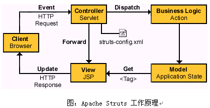 WebGrid CRM在技術(shù)實(shí)現(xiàn)上采用Sun公司的標(biāo)準(zhǔn)的MVC(Model-View-Controller)三層體系進(jìn)行架構(gòu),主要通過(guò)在Apache公司開發(fā)的Struts Framework的基礎(chǔ)上進(jìn)行應(yīng)用擴(kuò)展,參見下圖結(jié)構(gòu):