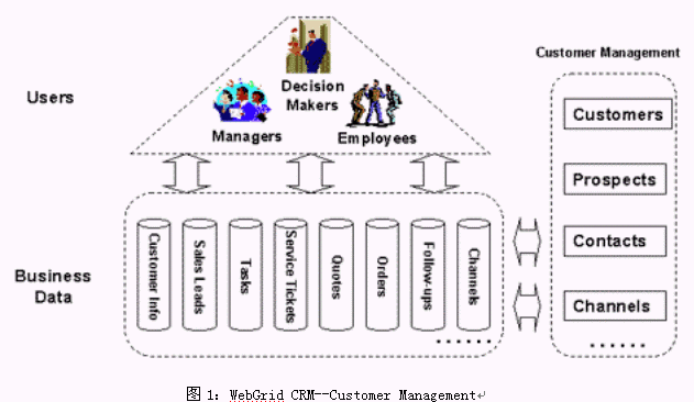 WebGrid CRM是基于CRM理念而設(shè)計(jì)的,它將面向客戶的所有業(yè)務(wù)進(jìn)行整合,提供了統(tǒng)一的業(yè)務(wù)平臺(tái),并使用工作流技術(shù)將各種業(yè)務(wù)緊密聯(lián)系起來(lái)。WebGrid CRM 的功能可以歸納為三個(gè)方面:1) 對(duì)銷售、營(yíng)銷和客戶服務(wù)三部分業(yè)務(wù)流程的信息化;2) 與客戶進(jìn)行溝通所需要的手段(如電話、傳真、網(wǎng)絡(luò)、Email等)的集成和自動(dòng)化處理;3) 對(duì)上面兩部分功能所積累下的信息進(jìn)行的加工處理,產(chǎn)生客戶智能,為企業(yè)的戰(zhàn)略戰(zhàn)術(shù)的決策作支持。見下圖所示: