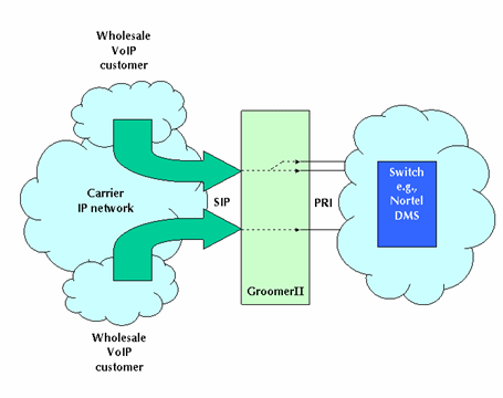 圖1中的GroomerII支持PRI協(xié)議,如:NI-2、ETS300和INS1500等,可以實現(xiàn)網(wǎng)關的功能把運營商自己的電路交換網(wǎng)和IP網(wǎng)絡相互連接在一起。這種設置允許網(wǎng)絡運營商向其他業(yè)務供應商提供批量VoIP業(yè)務。這類業(yè)務運營商據(jù)此可以向他們的客戶提供具有區(qū)分性的業(yè)務,如:利用SIP電話呼叫等。