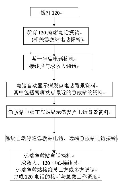 120急救中心接到求救電話后,120中心接線員在系統(tǒng)的配合下,自動呼通急救站,實(shí)現(xiàn)調(diào)度功能