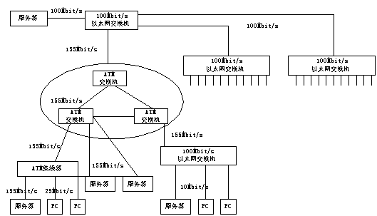 ATM 局域網(wǎng)是指以ATM結(jié)構(gòu)為基本框架的局域網(wǎng)絡(luò),它以ATM局域網(wǎng)交換機(jī)為交換點(diǎn),通過各種ATM接入設(shè)備,如ATM集線器、ATM網(wǎng)卡等將用戶接入局域網(wǎng)。ATM網(wǎng)絡(luò)具有帶寬大,速度高的優(yōu)點(diǎn),并能提供業(yè)務(wù)質(zhì)量QOS服務(wù),其性能大大優(yōu)于傳統(tǒng)共享式局域網(wǎng),但同時也面臨著高速以太網(wǎng)的挑戰(zhàn)。