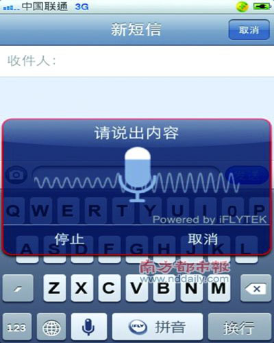 錄入結(jié)束后,點擊“停止”,輸入法會自動開始對剛才錄入的語音進行識別。需要注意的是,這個時候只有通暢的3G網(wǎng)絡(luò)或者W IFI網(wǎng)絡(luò),才能順利識別;如果信號欄顯示“E”或者“O”,都將無法得到正確識別,也無法錄入短信內(nèi)容。