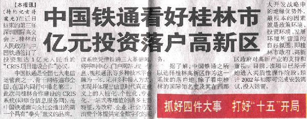 在此項目合作中,桂林市政府借助鐵通在電信市場上的綜合服務(wù)優(yōu)勢及佳訊飛鴻公司豐富的CALL CENTER系統(tǒng)集成經(jīng)驗,以高起點、大規(guī)劃的指導思想,建立以綜合信息服務(wù)、電子政務(wù)、企業(yè)客戶服務(wù)、旅游服務(wù)、電子教育服務(wù)和電子商務(wù)服務(wù)為核心的城市信息化交互平臺。根據(jù)該協(xié)議,鐵通網(wǎng)絡(luò)公司將投資1億元人民幣分階段建設(shè)桂林城市信息化標志性工程CRIS,一期投資建設(shè)100個座席。建成后的CRIS系統(tǒng)平臺,幫助桂林市對現(xiàn)有的各信息網(wǎng)數(shù)據(jù)加以全面整合、優(yōu)化,真正實現(xiàn)“多網(wǎng)合一”和信息的智能化、人性化。為旅游業(yè)、信息產(chǎn)業(yè)、高新產(chǎn)業(yè)、會展經(jīng)濟、招商引資和政府信息化等各個方面,提供最佳的、全方位的、高品質(zhì)的綜合信息服務(wù),全面帶動桂林市的經(jīng)濟發(fā)展。