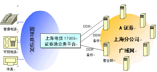 "17989證券通"服務(wù)是上海電信和黎明網(wǎng)絡(luò)共同向上海地區(qū)證券公司提供的通道外包式綜合服務(wù)。與電信提供的傳統(tǒng)的固定通道收費(fèi)服務(wù)不同,"17989證券通"服務(wù)的顯著特色是"集中交易,按需服務(wù)"。該項(xiàng)服務(wù)自推出以來(lái),就以其低成本、集中式電話交易和大量增值服務(wù)贏得了許多證券公司的普遍關(guān)注。下面是某大型綜合性證券公司采用"17989證券通"服務(wù)的案例剖析。