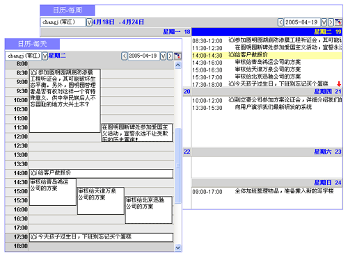 上圖"日歷管理"就借鑒了圖形化交互方法來安排日程和任務。這與您曾經(jīng)用過的桌面臺歷或記事本一樣,無需介紹就一目了然,并且要比在紙張上勾勾寫寫更方便、更有好處。例如,您此前計劃過日程,實際執(zhí)行有些變化,之后托托拽拽那個日程就可修改開始時間、持續(xù)時間,或修改主題內(nèi)容,有效提高了記錄工作日程的效率;又例如,可以根據(jù)需要設(shè)定"提醒"--即便對過期的、未及時處理的工作安排隨后也會提示,有了這樣的人性化服務助手,員工自然歡喜。