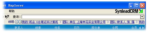 值得欣喜的是,部分CRM廠商意識到用戶迷路問題的嚴重性,并清楚IE瀏覽器具備的頁面歷史尋址(History Location)功能滿足不了頁面內(nèi)數(shù)據(jù)庫復雜、動態(tài)歷史條件的記憶,必須另外打造屬于CRM應用程序自身的歷史堆棧。少許CRM軟件開始提供歷史“后退”、“前進”按鈕,SynleadCRM歷史精確度保持領先地位。