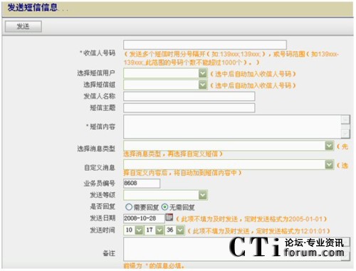 - 通過個人的Web方式的客戶端給系統(tǒng)預先設置好的個人或寫入對方手機號碼發(fā)送短信;