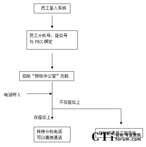 每個需要到企業(yè)辦公的員工,可以通過門禁系統(tǒng),或專門一臺PC上進行登入,通過后由系統(tǒng)自動分配或員工選擇一個空閑的座位,座位號與員工的分機號碼綁定,所有對這個員工分機的呼叫均被自動轉移到其座位上的辦公電話上;