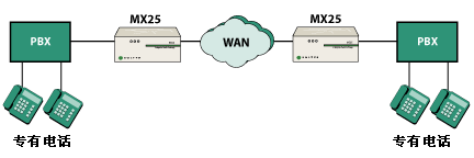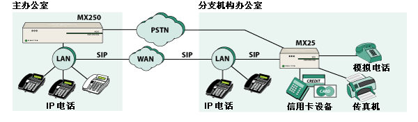 MX25 是一種能夠在兩種不同模式下工作的模塊化設(shè)備。在其中一種工作模式下,MX25 是一個(gè)通向 PSTN 網(wǎng)關(guān)的獨(dú)立 SIP。當(dāng)在這種模式下工作時(shí),MX25 轉(zhuǎn)換電話(huà)呼叫的格式,使其可以在 IP 網(wǎng)絡(luò)與公用電話(huà)網(wǎng)絡(luò)之間傳遞。另一種工作模式是,將 MX25 作為 MX250 的功能延伸系統(tǒng),用于不超過(guò) 25 個(gè)用戶(hù)的分支辦公室。在這種配置下,MX25 與 MX250 通信并交換有關(guān)用戶(hù)和設(shè)備的信息。即使連接 MX250 和 MX25 的 WAN 鏈路出現(xiàn)故障,MX25 也能繼續(xù)工作并處理來(lái)自/發(fā)往 PSTN 的傳入/傳出呼叫。