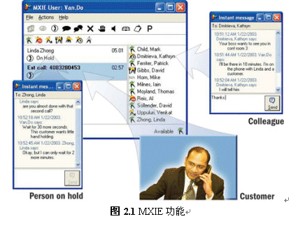 使用MXIE還提供了文本交流、收發(fā)語(yǔ)音郵件、收發(fā)傳真、發(fā)起電話會(huì)議或視頻會(huì)議、綁定話機(jī)等多種實(shí)用的溝通功能。除此以外,MXIE還集成了軟件電話功能,用戶外出時(shí)可以使用它來(lái)接聽(tīng)或撥打電話。