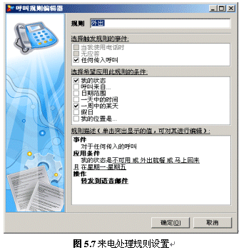 用戶可以設(shè)置一個(gè)或多個(gè)來(lái)電處理規(guī)則,來(lái)電處理規(guī)則能夠協(xié)助用戶處理來(lái)電,讓客戶得到最好的電話支持或服務(wù)。我們可以這么使用此功能,如:外出時(shí)將所有來(lái)電轉(zhuǎn)至語(yǔ)音信箱,節(jié)假日時(shí)將電話轉(zhuǎn)至手機(jī)等。