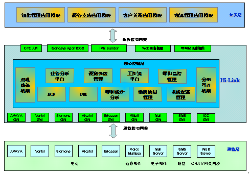 Hi-Link核心控制層包括以下幾個(gè)部分:ACD、IVR、呼叫統(tǒng)計(jì)分析、呼叫監(jiān)控管理、坐席質(zhì)量管理、系統(tǒng)配置管理、預(yù)測(cè)外撥管理、業(yè)務(wù)分析平臺(tái)、雙機(jī)熱備機(jī)制、分布互連機(jī)制、工作流平臺(tái)。