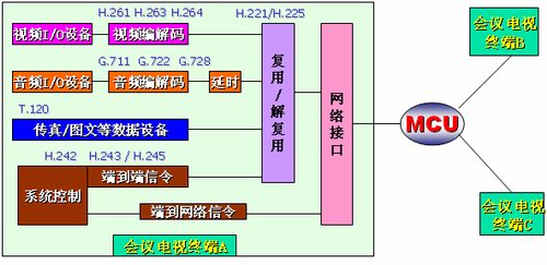 如圖所示:視頻會(huì)議終端將輸入進(jìn)來的視頻使用H.261、H.263或H.264協(xié)議、音頻使用G.711、G.722或G.728、數(shù)據(jù)、控制信令進(jìn)行單獨(dú)編碼,然后將編碼后的數(shù)據(jù)進(jìn)行“復(fù)用”打包后形成遵循網(wǎng)絡(luò)協(xié)議的數(shù)據(jù)包,通過網(wǎng)絡(luò)接口傳到MCU供選擇廣播。從MCU傳來的其他會(huì)場的數(shù)據(jù)包通過“解復(fù)用”,分別還原成視頻、音頻以及數(shù)據(jù)及控制信令分別相應(yīng)的輸出設(shè)備上回顯或執(zhí)行。