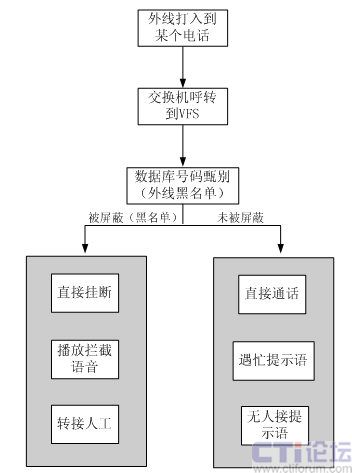 - 系統(tǒng)利用交換機(jī)的話音轉(zhuǎn)移功能,將轉(zhuǎn)移過(guò)來(lái)的來(lái)話信息進(jìn)行過(guò)濾處理,從而實(shí)現(xiàn)語(yǔ)音攔截的功能。