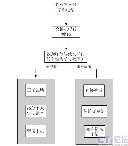 外線(主叫)撥打某一電話(被叫),在經(jīng)過(guò)VFS系統(tǒng)數(shù)據(jù)庫(kù)甄別后,如果該外線(主叫)存在于主叫屏蔽號(hào)碼段的黑名單數(shù)據(jù)庫(kù)中,該外線(主叫)將會(huì)被系統(tǒng)自動(dòng)屏蔽。如被屏蔽,則根據(jù)流程動(dòng)作,可以播放提示音、轉(zhuǎn)接人工或者直接掛斷。