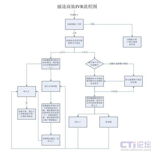 麗途商旅呼叫中心整個呼叫流程是:客戶通過全國400電話呼入系統(tǒng),IVR自動應(yīng)答,根據(jù)客戶來電號碼通過URL的方式和業(yè)務(wù)系統(tǒng)數(shù)據(jù)庫進行查詢該來電號碼是否是老客戶,然后直接播報客戶對應(yīng)的企業(yè)名稱和麗途的歡迎語,客戶可以進行訂單的審批和密碼驗證或者轉(zhuǎn)人工服務(wù);如果是來電號碼在數(shù)據(jù)庫中不存在,IVR系統(tǒng)提示客戶輸入企業(yè)編號或者轉(zhuǎn)接人工服務(wù),輸入企業(yè)編號還會在數(shù)據(jù)庫中查詢是否是已存在客戶并執(zhí)行相應(yīng)的流程,如是新客戶那么就會轉(zhuǎn)接人工服務(wù),由人工來進行訂單的制定、審批,密碼驗證等工作。