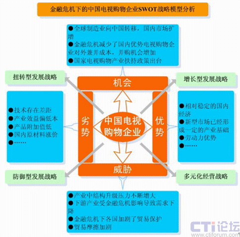 1992年至2009年以來(lái),電視購(gòu)物經(jīng)歷了從割據(jù)到統(tǒng)一,全國(guó)購(gòu)物頻道網(wǎng)絡(luò)化;從粗放到科學(xué),頻道運(yùn)營(yíng)模式專業(yè)化;從簡(jiǎn)介到深度,頻道編排方式規(guī)律化、從滯后到及時(shí),物流配送體系成熟化。電視購(gòu)物被譽(yù)為繼零售、超市之后的第三次銷(xiāo)售革命,電視購(gòu)物將成為金融危機(jī)經(jīng)濟(jì)形態(tài)下未來(lái)中國(guó)電視新的經(jīng)濟(jì)增長(zhǎng)點(diǎn),而付費(fèi)電視、數(shù)字網(wǎng)絡(luò)電視的發(fā)展,是中國(guó)電視購(gòu)物市場(chǎng)新的戰(zhàn)略機(jī)會(huì)。金融危機(jī)下的中國(guó)電視購(gòu)物企業(yè)SWOT戰(zhàn)略模型分析如下: