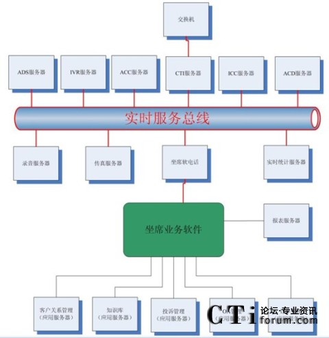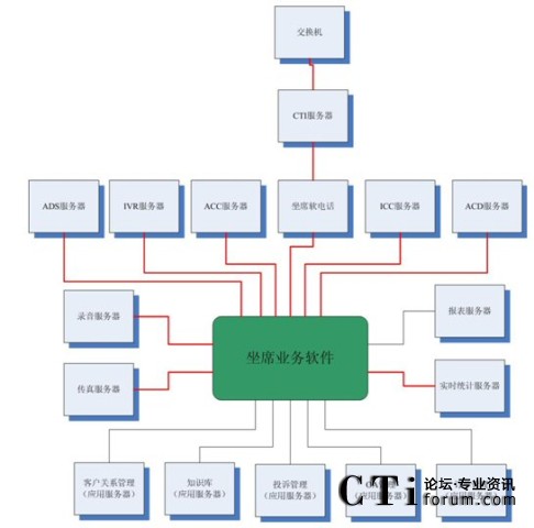 很多集成商或業(yè)務(wù)軟件開發(fā)商認為這種結(jié)構(gòu)過于復雜,而他們自身往往提供“整體解決方案”,即所有的服務(wù)器軟件基本上都是自己的,根據(jù)客戶的要求修改即可。例如,客戶關(guān)系管理、知識庫、投訴管理、OA、訂單管理以及坐席軟電話、ADS服務(wù)器、IVR服務(wù)器、ACC服務(wù)器、ICC服務(wù)器、ACD服務(wù)器、錄音服務(wù)器、傳真服務(wù)器、報表服務(wù)器、實時統(tǒng)計服務(wù)器都是自己來做,那么對于很多接口環(huán)節(jié)都可以節(jié)省了。