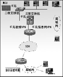 綜合業(yè)務(wù)數(shù)據(jù)網(wǎng)上的信息網(wǎng)VPN,連接省公司和各市公司的局域網(wǎng),桌面終端分布于省市兩級(jí)的局域網(wǎng)上。MCU通過三層交換方式接入省公司的信息網(wǎng),實(shí)現(xiàn)各個(gè)桌面會(huì)議終端的接入。在信息網(wǎng)上,要設(shè)置路由的QoS,實(shí)現(xiàn)桌面視音頻業(yè)務(wù)的優(yōu)先傳送。