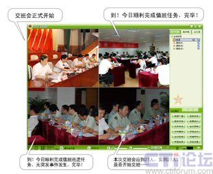網(wǎng)動(dòng)視頻會(huì)議系統(tǒng)的“多功能”使得某軍區(qū)對(duì)其應(yīng)用又作了新發(fā)現(xiàn),它把視頻會(huì)議系統(tǒng)與原有的作戰(zhàn)值班系統(tǒng)進(jìn)行了結(jié)合,通過網(wǎng)絡(luò)實(shí)現(xiàn)值班情況的可視通播和值班員之間的雙向音視頻實(shí)時(shí)交流,從而實(shí)現(xiàn)值班過程中對(duì)交接班的工作匯報(bào)以及突發(fā)事件的應(yīng)急處理。