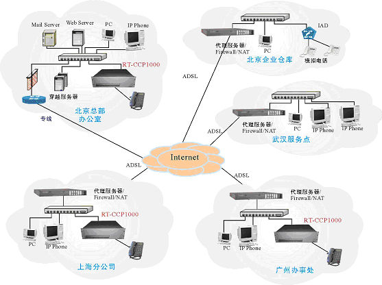 。。在北京、上海和廣州分別架設(shè)一個(gè)RT-CCP1000,利用其IP中繼通過(guò)Internet進(jìn)行組網(wǎng),建立一個(gè)統(tǒng)一通信系統(tǒng),武漢服務(wù)點(diǎn)直接部署IP電話(huà)終端作為內(nèi)部分機(jī),北京的企業(yè)倉(cāng)庫(kù)由于人數(shù)較多,且計(jì)算機(jī)應(yīng)用層次不高,可以使用IAD部署模擬話(huà)機(jī)作為內(nèi)部分機(jī)。北京總部辦公室通過(guò)路由器用專(zhuān)線方式接入Internet,有固定的公網(wǎng)IP地址,上海、廣州、武漢和北京的企業(yè)倉(cāng)庫(kù)都是采用ADSL方式接入Internet,無(wú)固定的公網(wǎng)IP,每個(gè)分支點(diǎn)的企業(yè)內(nèi)網(wǎng)通過(guò)防火墻/NAT連接Internet。
