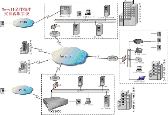 Novell中國技術(shù)支持中心采用融天科技的RT-CCP1000作為呼叫處理平臺,業(yè)務(wù)處理通過Internet用瀏覽器的方式使用美國現(xiàn)有的Siebel CRM業(yè)務(wù)系統(tǒng),作為Novell全球客戶服務(wù)支撐體系的一個分支,響應來自全球的客戶服務(wù);贗P網(wǎng)絡(luò),系統(tǒng)設(shè)立了遠端座席,為不同地區(qū)的用戶提供本地化、無差異化的服務(wù)。