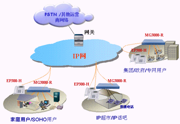 MG3000-R用戶(hù)駐地網(wǎng)關(guān)可以基于IP網(wǎng)絡(luò)提供優(yōu)質(zhì)的分組化語(yǔ)音流,使話音、傳真、數(shù)據(jù)在同一IP網(wǎng)絡(luò)中傳送。