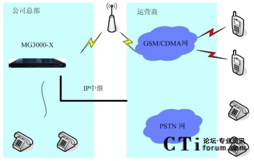 4、公司員工在公司外部時,可以用手機(jī)通過撥打公司“移動”總機(jī),再通過IP中繼,撥打目的固定電話號碼或者移動電話號碼。即間接的把話務(wù)轉(zhuǎn)移到了IP中繼呼出上,在一定程度上節(jié)省了通話費(fèi)用。
