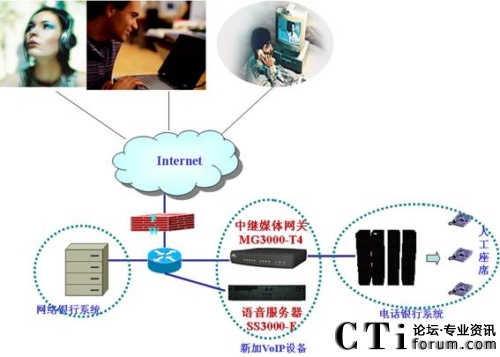 通過(guò)上述三環(huán)節(jié),Internet上的電話呼叫即可送入電話銀行的人工座席處,Internet上的客戶(hù)也就可以通過(guò)計(jì)算機(jī)上的耳麥和電話銀行座席人員通話。拓?fù)涫疽鈭D如下: