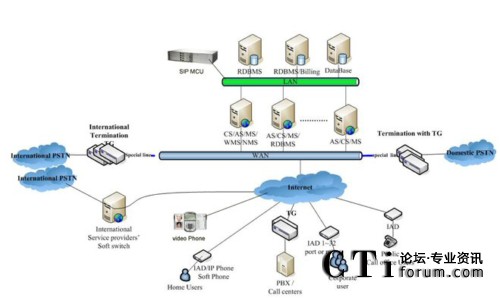 計費系統(tǒng)將把視頻通話和普通的語音通話分開來計費,視頻會議業(yè)務也可以作為一項特殊業(yè)務單獨計費。所有這些業(yè)務都使用相同的計費和OAM系統(tǒng)。在這個運營商級軟交換系統(tǒng)中,已經把視頻業(yè)務完全集成進了系統(tǒng)。下面是網絡示意圖: