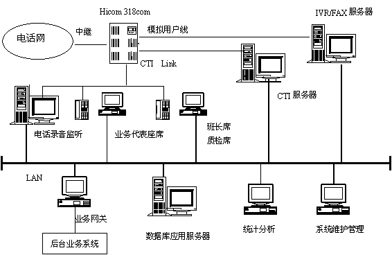 主要包括:Siemens Hicom 318com交換機、CTI服務器、IVR/FAX服務器、業(yè)務代表座席、班長和質(zhì)檢座席、電話錄音監(jiān)聽系統(tǒng)、數(shù)據(jù)庫應用服務器、統(tǒng)計分析工作站、系統(tǒng)維護管理工作站、業(yè)務網(wǎng)關(guān)、網(wǎng)絡系統(tǒng),其邏輯結(jié)構(gòu)下圖所示。