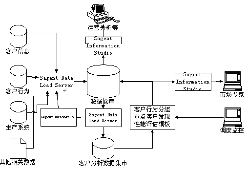 易虹eCRM解決方案,采用Sagent Real Time e-Business Solution作為數(shù)據(jù)倉庫建設(shè)平臺(tái)。Sagent Solution提供了數(shù)據(jù)倉庫建設(shè)、數(shù)據(jù)分析和數(shù)據(jù)倉庫管理的全套的工具。利用這些工具,用戶可以快速地實(shí)現(xiàn)數(shù)據(jù)倉庫和客戶分析系統(tǒng)。