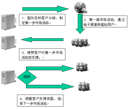 電子化營銷過程,是通常是多步驟市場活動。每個步驟完成一定的工作,下一步的市場活動將根據客戶對市場活動的反饋和內置的市場活動的規(guī)則進行選擇。而且每個步驟客戶市場活動的反饋,都由電子化營銷系統(tǒng)中的反饋處理系統(tǒng)集中到CRM系統(tǒng)中。從而為市場活動效果評估,提供數據上的支持。