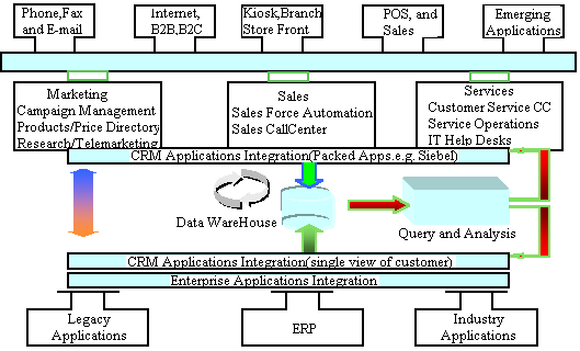 傳統(tǒng)的數(shù)據(jù)庫及中間件軟件廠商,都能提供一些“point solution”(指基于某一單獨技術(shù)領(lǐng)域),例如,單獨的客戶服務(wù)CallCenter方案,數(shù)據(jù)倉庫/商業(yè)智能BI解決方案。Compaq向客戶提供的是完整的CRM方案套件,其技術(shù)組成主要包括前端的基于多種接觸媒體(phone,fax,email,web)CallCenter;核心部分的Sales Force Automation,Marketing Automation,Service Operation;以及后端的DataWareHouse/BI,ERP及原有集成應(yīng)用系統(tǒng)(Legacy Application)的集成等部分。通過下圖我們將詳細(xì)描述康柏的整體CRM方案框架及其解決方案: