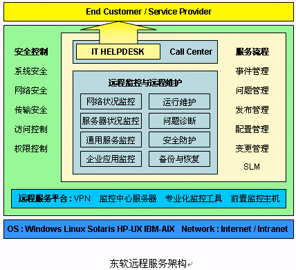 東軟遠(yuǎn)程服務(wù)解決方案涵蓋了Helpdesk服務(wù)、遠(yuǎn)程監(jiān)控與維護(hù)、服務(wù)流程控制、服務(wù)質(zhì)量保證、網(wǎng)絡(luò)與系統(tǒng)安全等多個(gè)方面的內(nèi)容,不但在日常的監(jiān)控和遠(yuǎn)程維護(hù)方面采用了高安全性的服務(wù)模式,而且基于ITIL規(guī)范在整體的服務(wù)規(guī)范、服務(wù)質(zhì)量方面形成了自身的服務(wù)標(biāo)準(zhǔn)流程,從而有效地提高了服務(wù)水平和客戶滿意度。