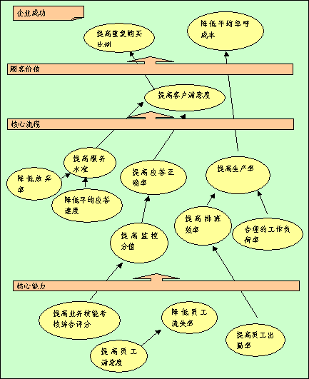 全程全網(wǎng)考核策略目標(biāo)因果關(guān)系圖是"平衡計(jì)分卡"應(yīng)用的重要環(huán)節(jié),在此要特別強(qiáng)調(diào)?因?yàn)樗菍⒏鶕?jù)公司遠(yuǎn)景規(guī)劃以及使命確定的四個(gè)考核維度轉(zhuǎn)化為全程全網(wǎng)考核系統(tǒng)進(jìn)入實(shí)際操作階段之關(guān)鍵步驟。在平衡記分卡的設(shè)計(jì)過(guò)程中,它起著承前啟后的作用,在構(gòu)建呼叫中心全程全網(wǎng)考核系統(tǒng)中全程全網(wǎng)考核策略目標(biāo)因果關(guān)系圖的突破性銜接功能-以其邏輯性的架構(gòu)來(lái)界定和描述實(shí)現(xiàn)全面績(jī)效考核的策略方案。將公司成功、客戶(hù)價(jià)值、核心流程和呼叫中心核心能力之間的關(guān)聯(lián)清晰地呈現(xiàn),并將企業(yè)的策略與其績(jī)效衡量系統(tǒng)相銜接。