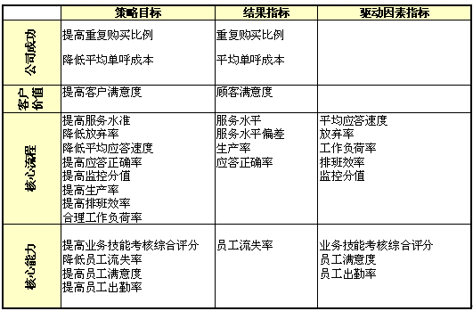1)公司成功;2)客戶(hù)價(jià)值;3)核心流程;4)核心能力;成為呼叫中心全程全網(wǎng)考核衡量的四大維度,實(shí)際反映了呼叫中心運(yùn)營(yíng)管理中成本、客戶(hù)、內(nèi)部流程及呼叫中心的學(xué)習(xí)與成長(zhǎng)的四個(gè)至關(guān)重要的領(lǐng)域,是實(shí)現(xiàn)公司遠(yuǎn)景規(guī)劃與使命的營(yíng)運(yùn)管理核心。