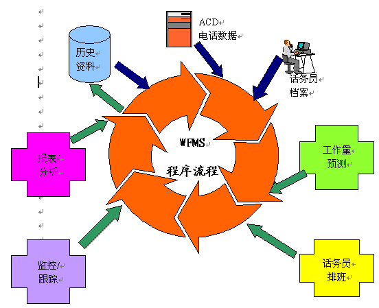 如上面所描述的WFMS流程,最初開始于歷史的電話信息、目前的ACD數(shù)據(jù)和服務(wù)代表的簡介。從這些綜合的信息,做出對工作量的預測,從而從本質(zhì)上決定了配備給呼叫中心的服務(wù)代表數(shù)量。了解了服務(wù)代表的需求數(shù)量,一個適用于任何時間段的工作時間表就可以產(chǎn)生了,包括每天的,每周的,每月的;谶@一點,主管人就可以監(jiān)控服務(wù)代表的行為,追蹤來電,并分析不同種類的來電分組,做出應對假定情景的方案,從而產(chǎn)生各種各樣的報告和圖表。