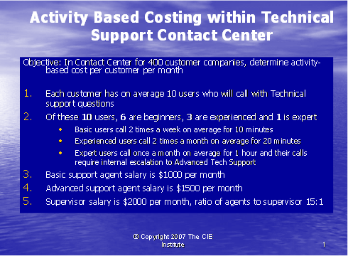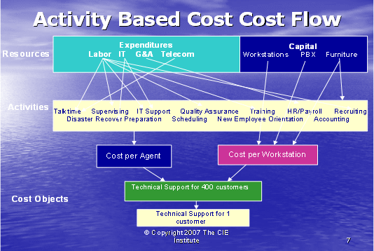呼叫中心業(yè)務(wù)包括大量單獨(dú)的行動(dòng) — 行動(dòng)成本法(ABC)使我們跟蹤那些行動(dòng)以至于更清楚地了解支持一個(gè)客戶的所需事項(xiàng)。傳統(tǒng)上,呼叫中心成本是根據(jù)投入來衡量的:人數(shù),設(shè)備量,設(shè)施的規(guī)模。為了了解服務(wù)一個(gè)客戶所花費(fèi)的成本量,呼叫中心的主管必須確定這些行動(dòng)如何與該客戶相聯(lián)系的。只有做到這一點(diǎn),行業(yè)才能知道來自該客戶的收入是否超出為其提供服務(wù)所產(chǎn)生的成本。如果服務(wù)的成本大于收入,那么這個(gè)客戶對于行業(yè)來說是無利可圖的,所以確定哪些客戶有利可圖和哪些客戶無利可圖是很重要的,這樣,行業(yè)才可以根據(jù)客戶定價(jià)和客戶服務(wù)策略有利地進(jìn)行管理。