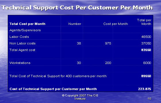 最后,我們可以如同下面圖表10所示,把所有的信息放在一起。每個(gè)客戶的技術(shù)支持的實(shí)際成本包括間接人工成本和工作場地成本,這是服務(wù)一個(gè)客戶所花費(fèi)成本的正確的反映。