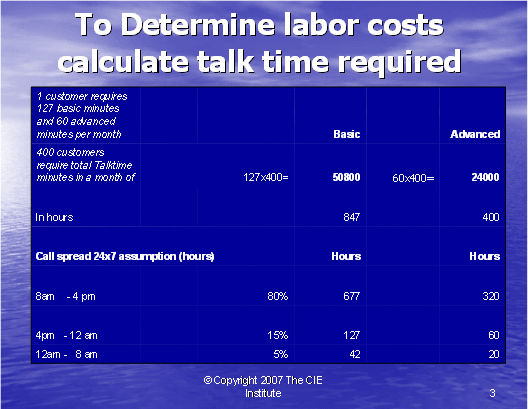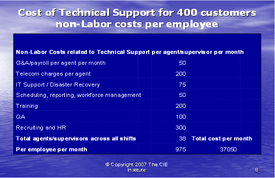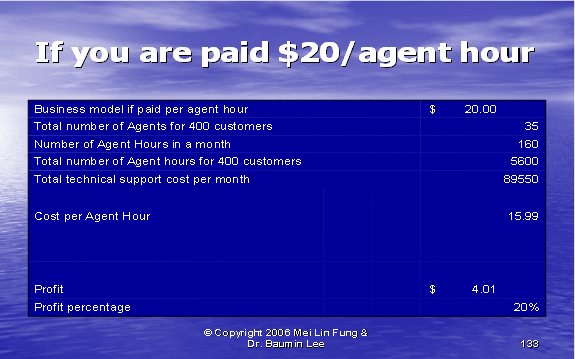 根據(jù)圖表12,我們可以算出第二種方式的利潤百分比。如果我們假設(shè)每個(gè)客戶每年的收入是20,000美元,其中分配給呼叫中心部門的收入是20%。我們每個(gè)客戶每月的收入是333.33美元,每個(gè)客戶月的成本是223.88美元(參見圖表10)。這導(dǎo)致我們來自每個(gè)客戶每月的利潤是109.46美元——這將產(chǎn)生33%的利潤率。
