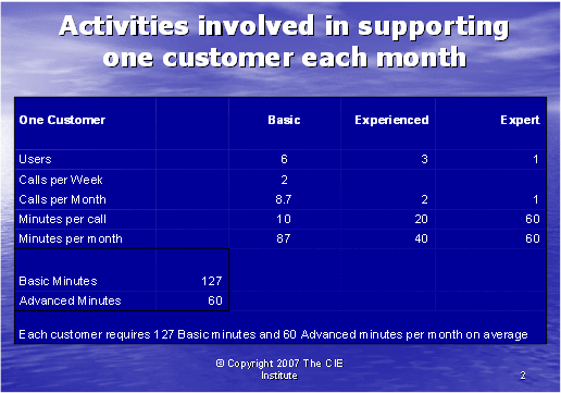 圖表1為我們提供了重要的信息,有助于我們計(jì)算一般的客戶在基礎(chǔ)和高級兩種技術(shù)支持中所需的技術(shù)支持的通話時(shí)長。我們需要區(qū)分這兩種技術(shù)支持,因?yàn)樘峁└呒壖夹g(shù)支持的座席的月薪是2000美元,比提供基礎(chǔ)技術(shù)支持,月薪為1000美元的座席每月所花的成本要高。那么,面臨有經(jīng)驗(yàn)的客戶使用者時(shí)該怎么做呢?因?yàn)橹挥袑I(yè)客戶使用者才能要求高級座席支持,所以他們的需要似乎可以由與初級客戶使用者打交道的基礎(chǔ)座席處理。