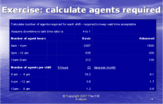在我們計(jì)算出所需的座席數(shù)之前,我們必須了解一個(gè)座席的付薪工作時(shí)間和他的通話時(shí)長的區(qū)別,通話時(shí)長是座席真正花在電話上面對客戶的時(shí)間。一個(gè)座席不會(huì)一直處理電話,其它的時(shí)間用于培訓(xùn),休息,與主管獨(dú)處,部門會(huì)議,公司內(nèi)部為給客戶提供準(zhǔn)確的回答而進(jìn)行研究,對內(nèi)對外寫郵件,準(zhǔn)備下一個(gè)客戶的電話。在每個(gè)呼叫中心中,通話時(shí)長和停工時(shí)長的比率是不同的。對于復(fù)雜易變的產(chǎn)品,花在培訓(xùn)上的時(shí)間會(huì)更多。在新產(chǎn)品被頻繁介紹的呼叫中心,就需要更多的時(shí)間去研究關(guān)于新產(chǎn)品的回答。為了更精確,一個(gè)座席一周的工作時(shí)長應(yīng)該與其通話時(shí)長相比較,以便真正確定通話時(shí)長與停工時(shí)長的比率。在我們的例子中,我們假設(shè)停工時(shí)長和通話時(shí)長的比率為4:1,也就是說,每1小時(shí)通話時(shí)間,相對應(yīng)4小時(shí)停工時(shí)間。