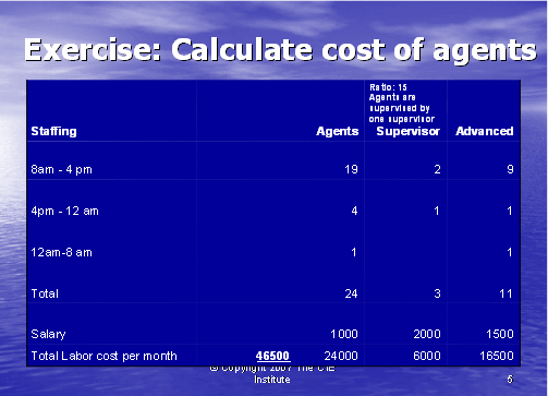 我們下一步就是計(jì)算出主管的成本。每次排班至少需要一個(gè)主管,如果這一排班的座席數(shù)要少一些,主管則也應(yīng)該能夠處理一些技術(shù)支持的電話。在這個(gè)例子中,我們將假設(shè)主管擁有高級支持座席的技術(shù)技巧。在圖表5中,你將看到我們使用了圖表4所得出的座席數(shù),并假設(shè)這是每次排班話務(wù)量中所需的各種類型員工的數(shù)量:基礎(chǔ),高級和主管。我們同時(shí)用圖表1中的薪資去計(jì)算座席和主管支持400個(gè)客戶的總成本。通過把每種座席單獨(dú)的成本相加(24個(gè)基礎(chǔ)座席,11個(gè)高級座席和3個(gè)主管),得出每月的人工成本為46,500美元。